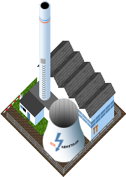 A power plant produces electricity for your factories and residential areas. A power plant produces much more elcetricity than a windmill but also causes pollution.